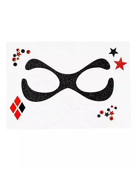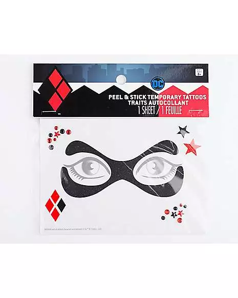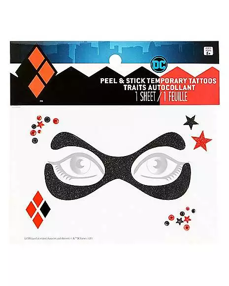Complete your Harley Quinn look in minutes with these officially licensed DC Comics Harley Quinn Peel and Stick Face Tattoo Decals! Peel and stick to clean, dry skin to sparkle and shine in Harley’s signature red and black color scheme.